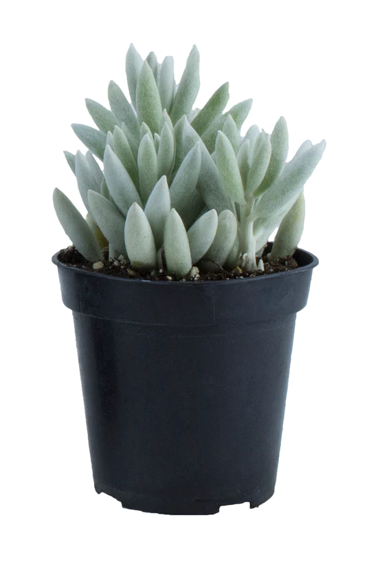 Senecio haworthii is a unique plant with elongated grey/green leaves covered in a white, velvety coating. The plant can grow tall, leggy stems, but can be trimmed back and cuttings re-rooted. The plant stem can darken as it grows. A great plant to add textural and color interest to mixed succulent pots.