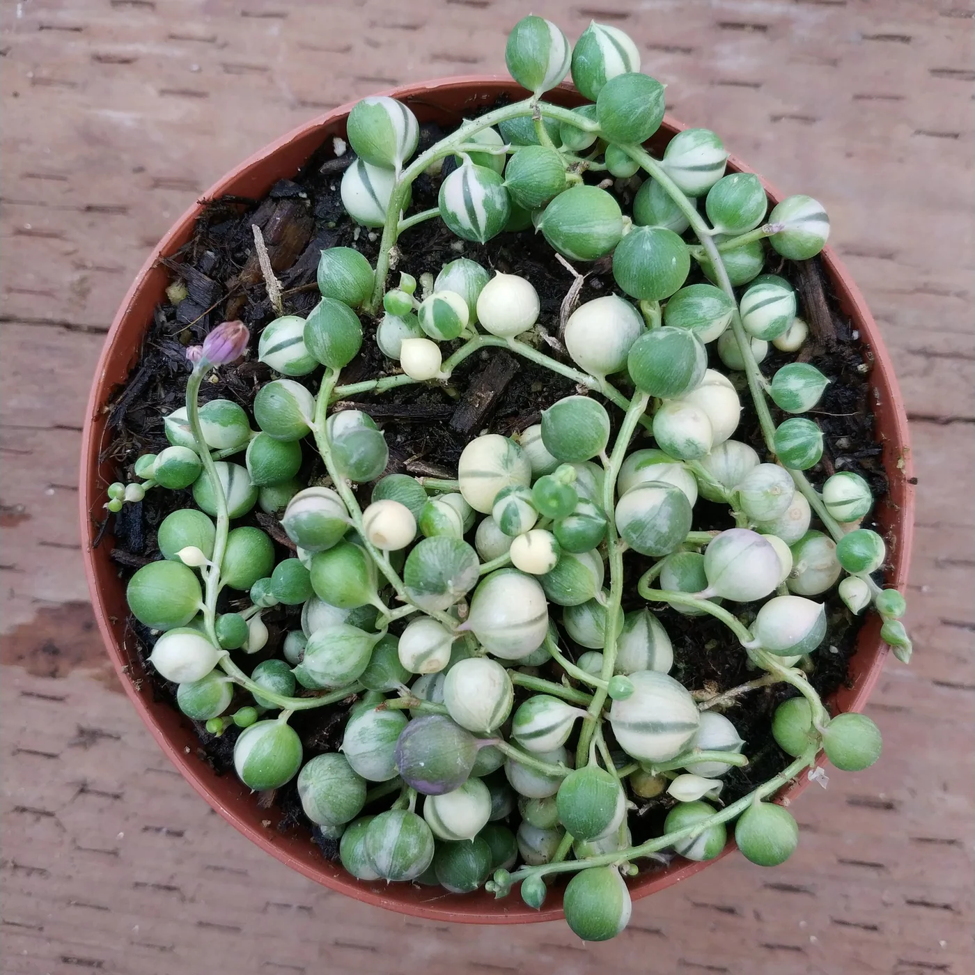 In the variegated version of String of Pearls, the pearl-like leaves are swirled in cream, green, and sometimes even pink and purple colors with the right combination of sun and water. For a full, mature look, prune long strands and place back in the pot to re-root. Summer Dormant Partial.